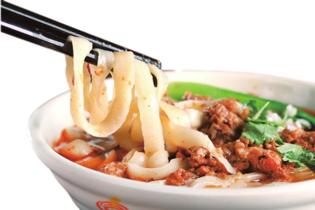 在開始削面之前,非常重要的步驟就是和面和醒面。和面的面和水需要按照一定的比例,同時(shí)對(duì)水溫也有一定的要求,冬天要用熱水,夏天要用涼水,春秋要用溫水。和好面之后緊接著就是醒面,需要用濕布蓋住面團(tuán)醒20分鐘左右。如果說吃刀削面是飽了口福,那么看刀削面下鍋可稱之為飽了眼福。一只手托著放著面團(tuán)的案板,另一只手拿著削面刀,削面刀又分為片刀和勾刀,削面時(shí),出力要平,用力要均,削出的面條中間厚兩邊薄,一葉連著一葉,在空中劃出一道道弧形白線,落入鍋中的面條好似一條條銀魚,隨著熱水的翻滾不斷舞動(dòng)。有順口溜贊曰:“一葉落鍋一葉飄,一葉離面又出刀,銀魚落水翻白浪,柳葉乘風(fēng)下樹梢?!?/p>