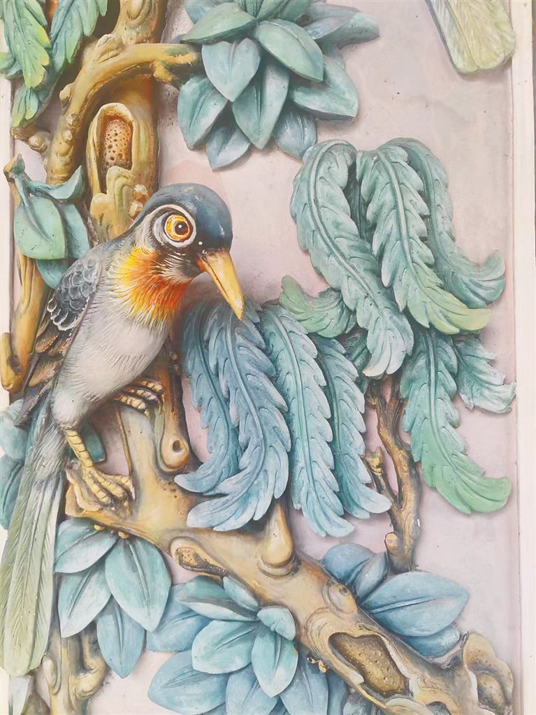 在海南的灰塑作品中,留白的運用同樣有“以無勝有”的視覺效果。“灰塑作品色彩五彩斑斕,一眼看過去容易產生錯亂的感覺,這時候留白就顯得很重要?!卞竞iw酒店負責人符燕舞說,灰塑作品有明顯的寫實風格,所呈現(xiàn)的物象紛繁多彩。如果要將灰塑作為一種藝術品保留下來,用留白的手法為作品增添美感十分必要。