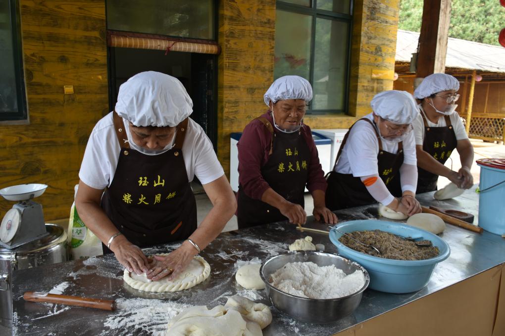 張小女制作的“大團(tuán)圓”月餅體現(xiàn)了當(dāng)?shù)靥厣?。澤州粗月餅看上去像一個(gè)鎖著花邊的圓形面餅,內(nèi)包兩層冰糖、花生、葡萄干、核桃仁等雜碎餡料,表面裝飾圖案,或蒸或烤而成。講究的圖案比較復(fù)雜,但張小女喜歡在村口拔棵野草,洗干凈后,印在上面,充滿野趣。
