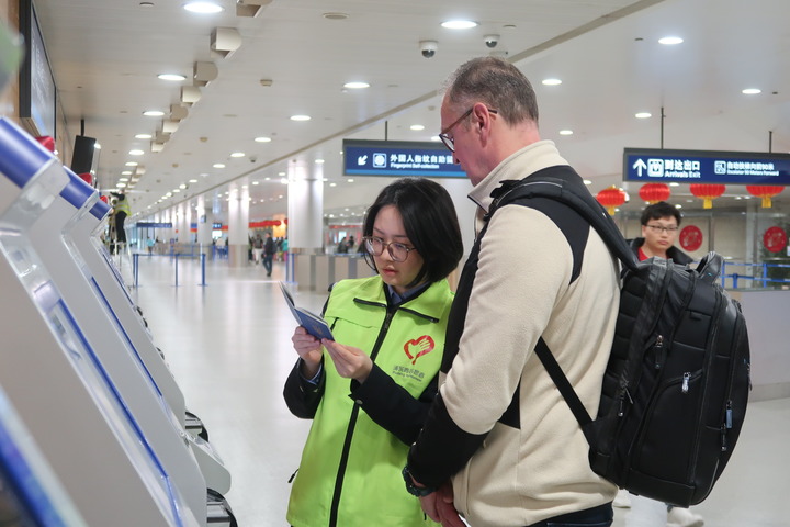 上海機(jī)場(chǎng)邊檢“百人外語(yǔ)志愿服務(wù)隊(duì)”民警正在協(xié)助外國(guó)旅客辦理入境手續(xù)。新華社記者唐斯琦 攝