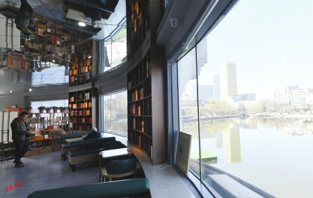 4月9日,依省城文瀛湖而建的太原新華書(shū)店文瀛城市書(shū)房中,讀者在靜謐中品味書(shū)香。